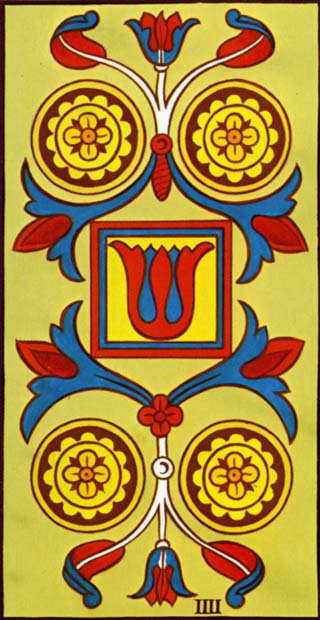 A posse of youths are brandishing staves, as if in sport or strife. It is mimic warfare, and hereto correspond the divinatory meanings. Divinatory Meanings: Imitation, as, for example, sham fight, the strenuous competition and struggle for the search after riches and fortune. Hence some attributions say that it is a card of gold, gain, opulence. Reversed: Litigation, disputes, trickery, contradiction.