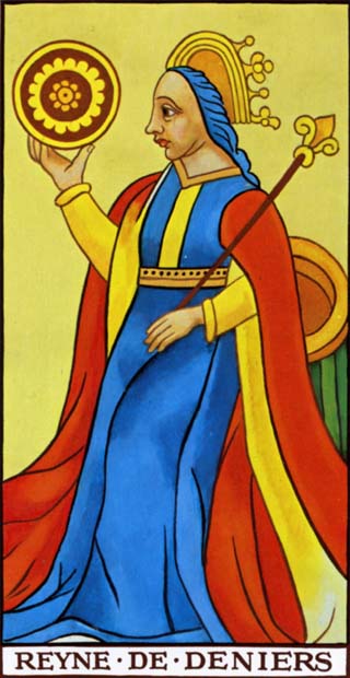 The face suggests that of a dark woman, whose qualities might be summed up in the idea of greatness of soul; she has also the serious cast of intelligence; she contemplates her symbol and may see worlds therein. Divinatory Meanings: Opulence, generosity, magnificence, security, liberty. Reversed: Evil, suspicion, suspense, fear, mistrust.