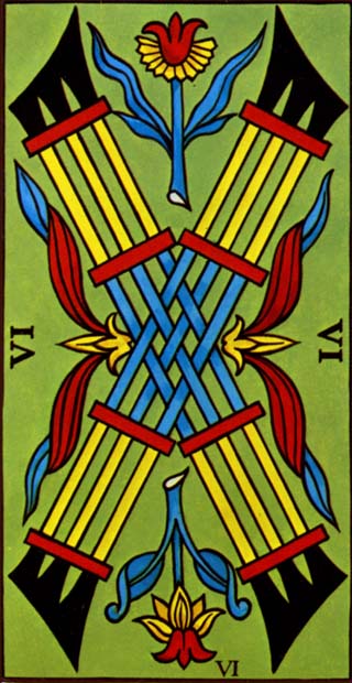 A laurelled horseman bears staff adorned with laurel crown; footmen with staves are at his side. Divinatory Meanings: The card has been so designed that it can cover several significations; on the surface, it is a victor triumphing, but it is also great news, such as might be carried in state by the King’s courier; it is expectation crowned with its own desire, the crown of hope, and so forth. Reversed: Apprehension, fear, as of a victorious enemy at the gate, treachery, disloyalty, as of gates being opened to the enemy, etc.