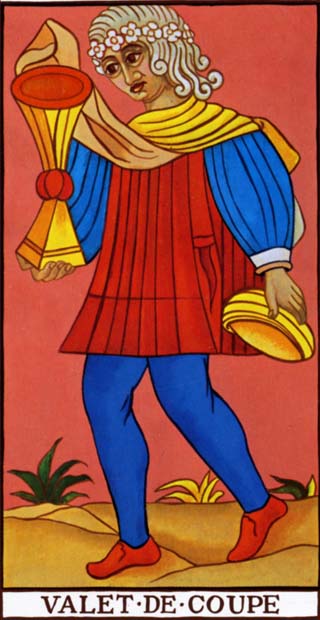 A fair, pleasing, somewhat effeminate page, of studious and intent aspect, contemplates a fish rising from a cup to look at him. Divinatory Meanings: Fair young man, one impelled to render service and with whom the Querent will be connected; a studious youth; news, message; application, reflection, meditation; also these things directed to business. Reversed: Taste, inclination, attachment, seduction, deception, artifice.